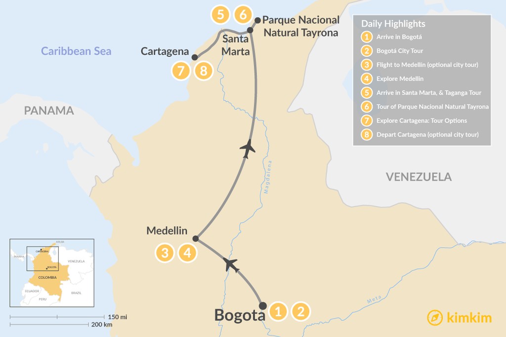Map of Discover Colombia’s Cities & Beaches – 8 Days