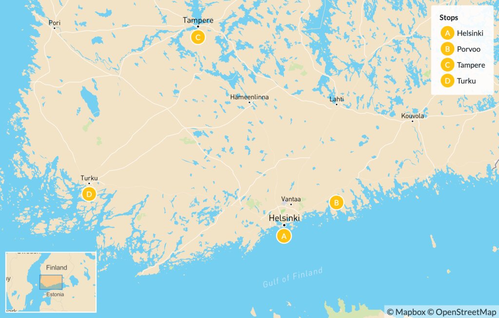 Map of Discover Finland’s Golden Triangle: Helsinki, Tampere & Turku – 6 Days