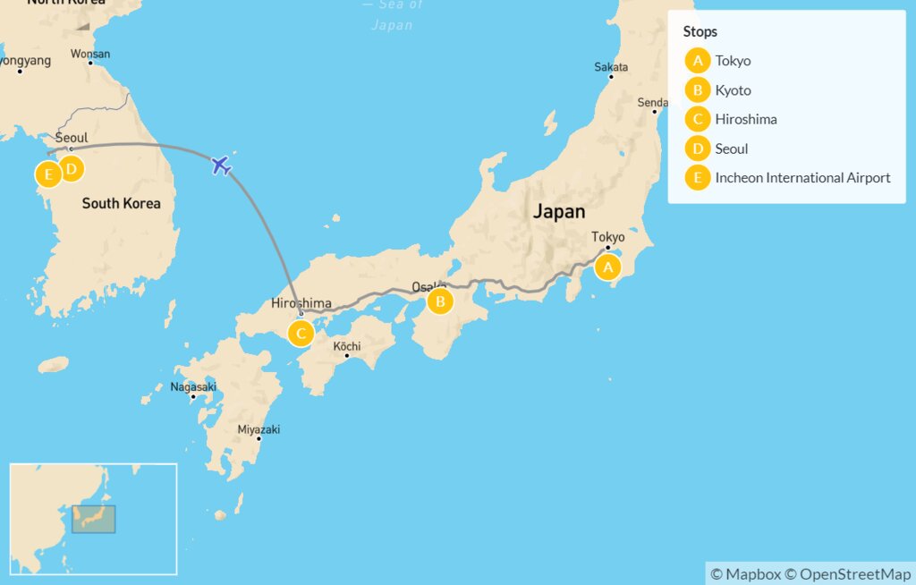 Map of Discover Japanese & Korean Culture: Tokyo, Kyoto, Hiroshima & Seoul – 10 Days