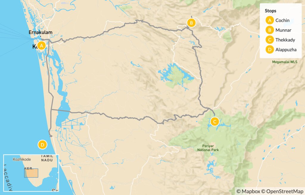 Map of Discover Kerala Tour – 6 Days