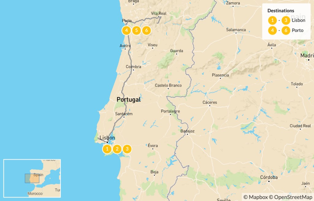 Explore Portugal’s two major cities of Lisbon and Portugal, with guided walking tours leading you through historic streets filled with cathedrals, monasteries, and lively squares. Enjoy local food with stops at market halls and historic cafes, plus a live Fado performance to experience some of the country’s traditional music. Take day trips to the countryside to find sites such as the Pena Palace in Sintra, the Douro Valley for wine tastings and a river cruise, and relaxing beach vibes of the Portuguese Riviera.