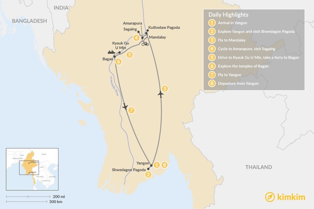 Map of Discover Myanmar’s Ancient Capitals: Yangon, Mandalay, and Bagan – 8 Days