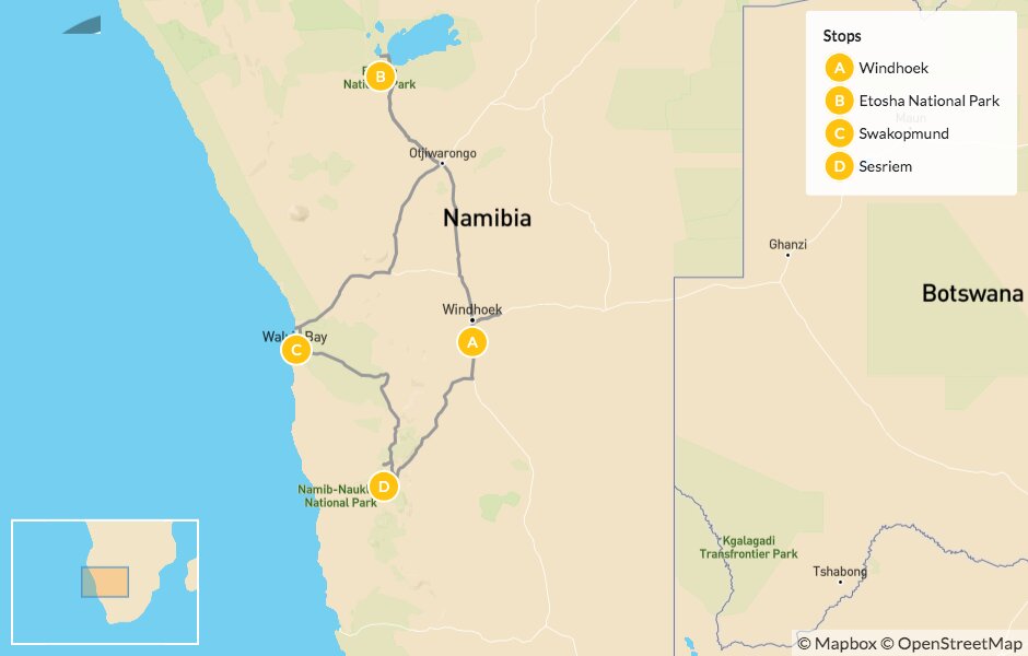 Map of Discover Namibia’s Dunes, Coast & Wildlife – 5 Days