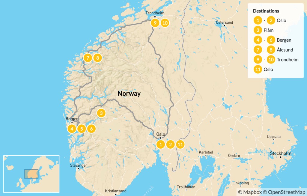 Map of Discover Norway by Train and Boat: Oslo, Bergen, Aurland, and Trondheim – 12 Days