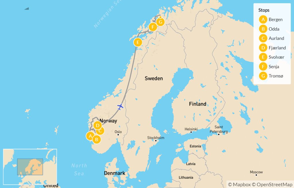 Map of Discover Norway’s Natural Wonders from West to North – 13 Days
