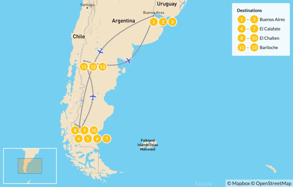 Map of Discover Patagonia: Buenos Aires, El Calafate, El Chaltén, & Bariloche – 14 Days