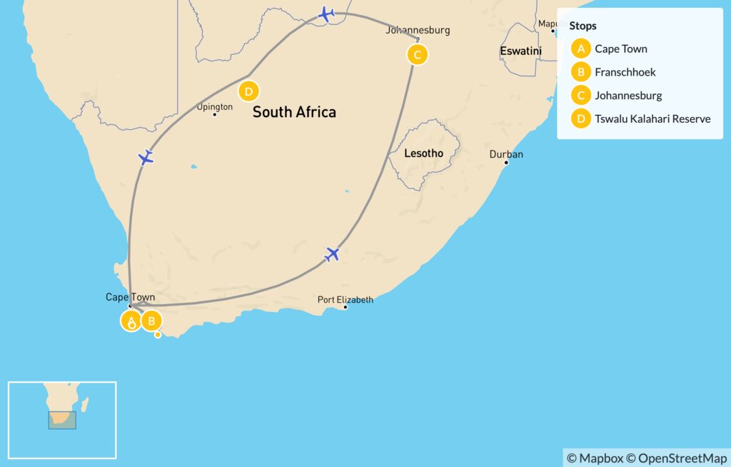 Map of Discover South Africa: Cape Town, Winelands, Johannesburg & Tswalu Kalahari – 14 Days
