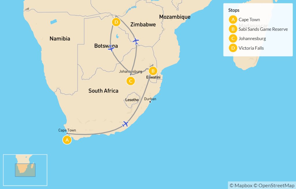 Map of Discover South Africa’s Wildlife & Wine & Zimbabwe’s Victoria Falls – 9 Days