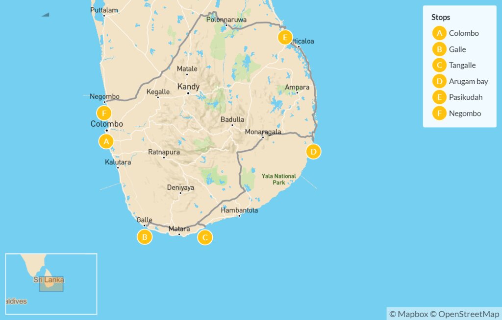 Map of Discover Sri Lanka’s Coastal & Cultural Treasures – 15 Days