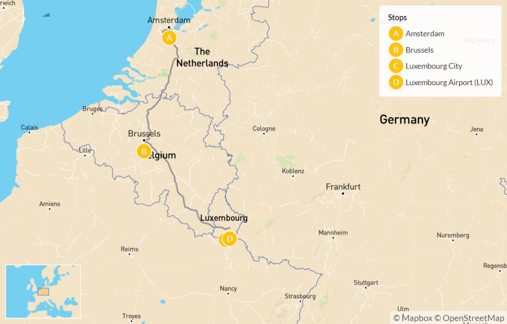 Map of Discover the Benelux Capitals: Amsterdam, Brussels & Luxembourg City – 7 Days