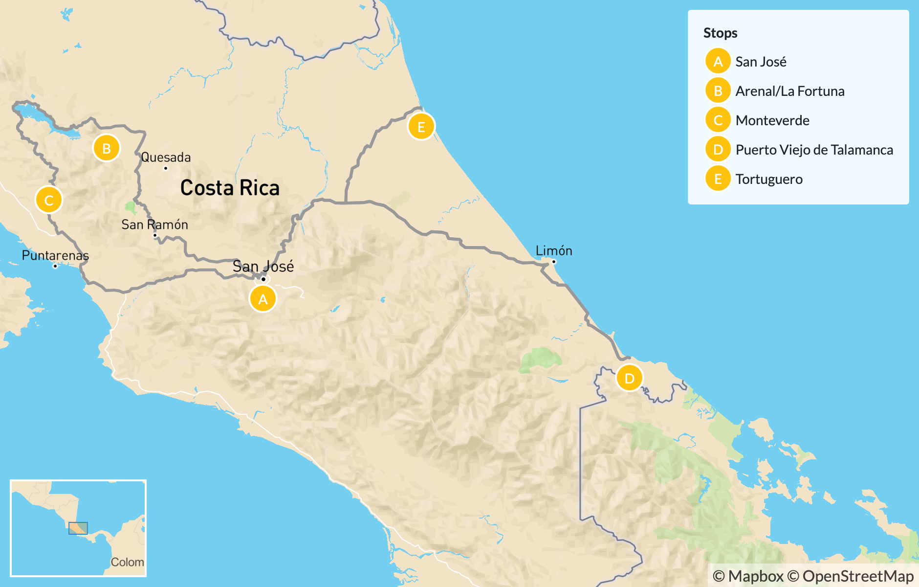 Offering an appealing mix of outdoor adventures, relaxation, and cultural experiences, this 16-day itinerary around Costa Rica is a traveler’s favorite. Start with volcano hikes and hot springs in Arenal, then explore Monteverde’s cloud forest on a canopy tour and an excursion on horseback. Go whitewater rafting down the Río Pacuare, visit a wildlife rehabilitation center in Puerto Viejo, and enjoy a boat tour along the canals of Tortuguero National Park before heading to San José, where the trip ends.