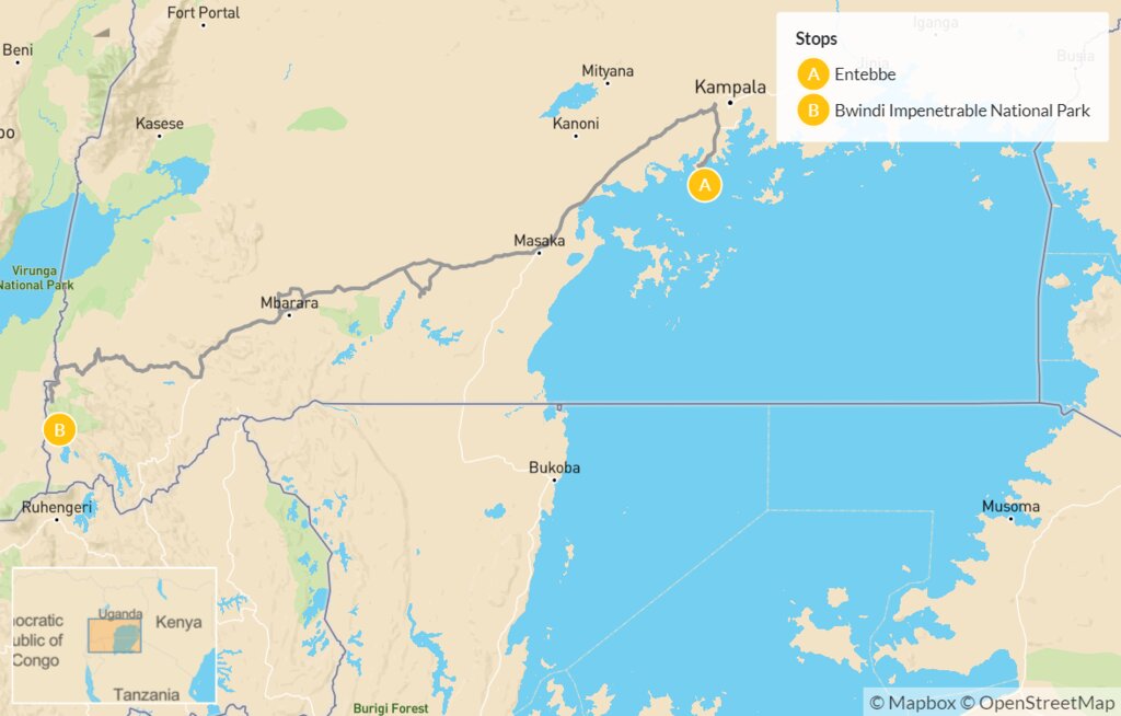 Map of Discover Uganda’s Entebbe & Bwindi Impenetrable Forest – 5 Days