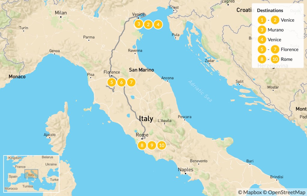 | Day 1 | Arrive in Rome, Travel to Venice | Venice |