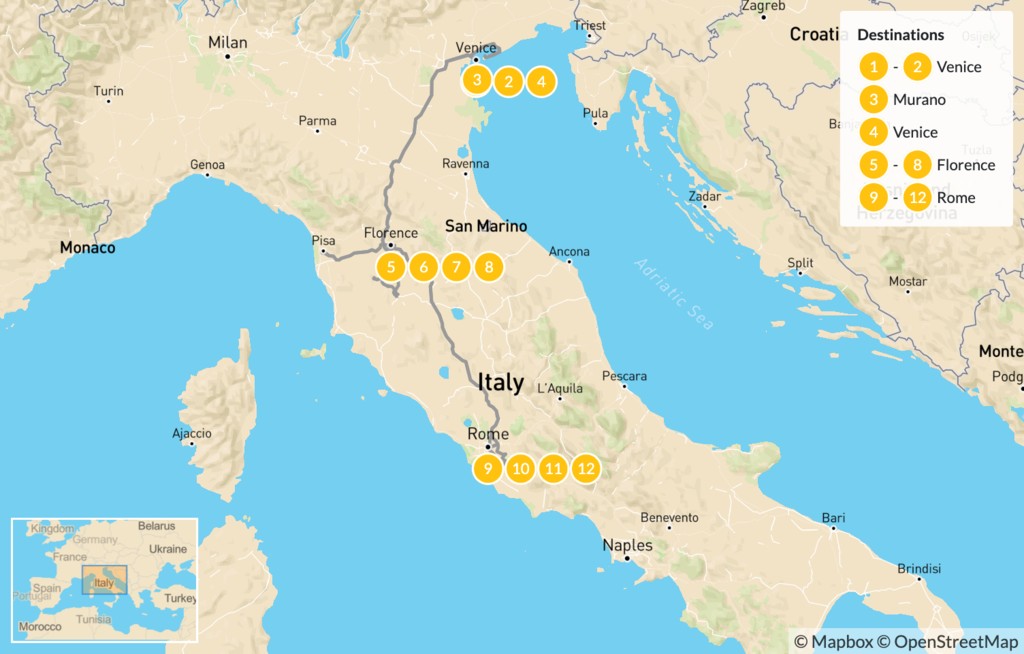 | Day 1 | Arrive in Rome, Travel to Venice | Venice |
