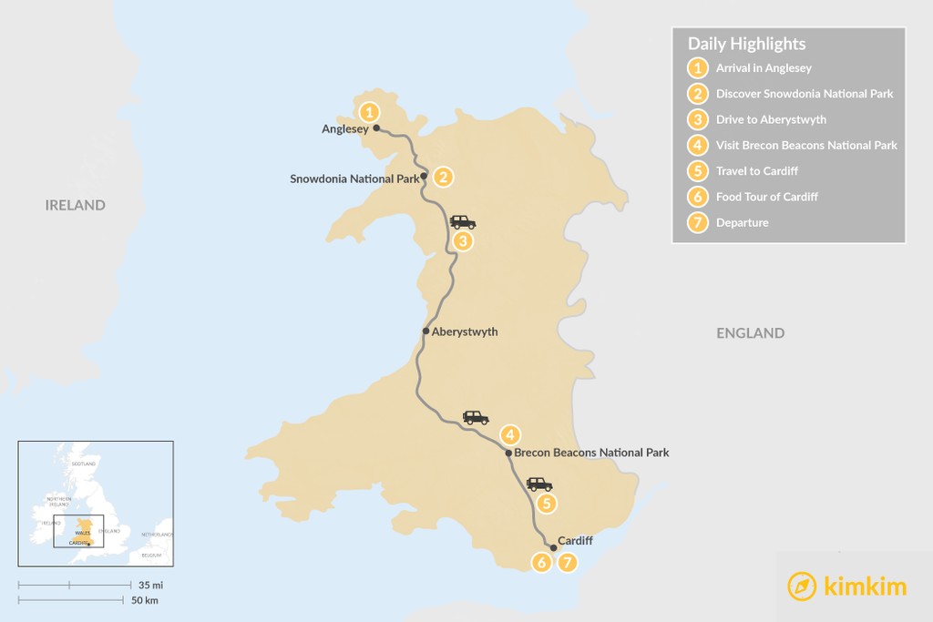 Map of Discover Wales: Anglesey, Snowdonia, Brecon Beacons & Cardiff – 7 Days