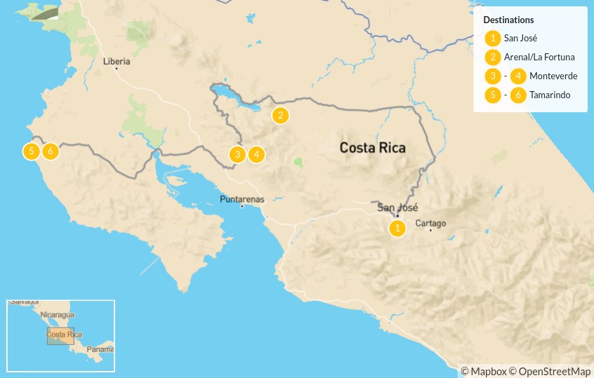 Map of Diverse Costa Rica: Arenal, Monteverde & Tamarindo – 7 Days