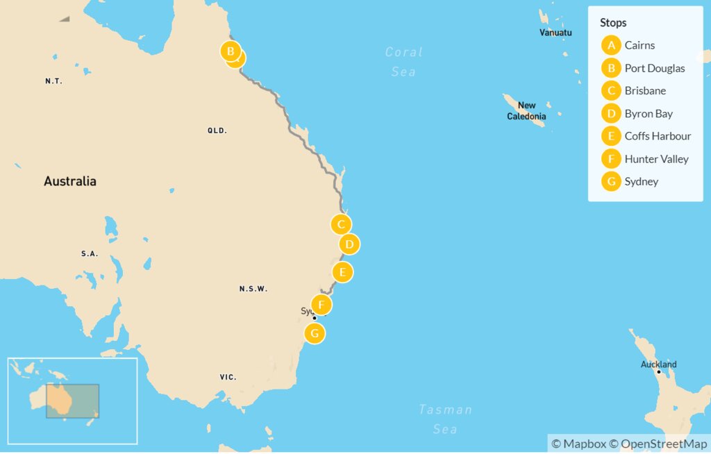 Map of East Coast Australia Tour & Road Trip: Cairns to Sydney – 15 Days