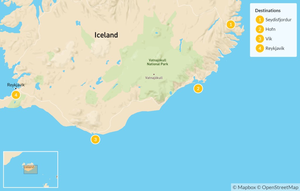 Map of East Fjords, South Coast, & Reykjavik – 5 Days