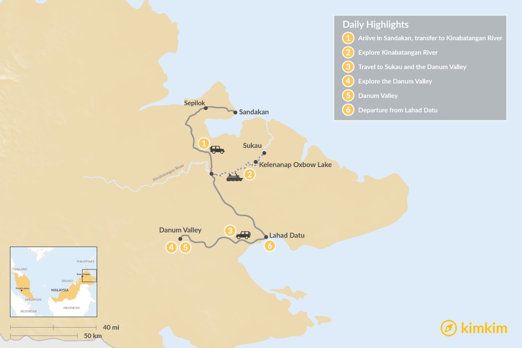 Map of Eastern Borneo Wildlife Tour – 6 Days