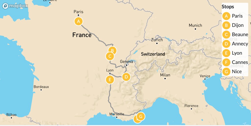 Map of Eastern France Roadtrip: Paris, Dijon, Beaune, Annecy, Nice, & More – 17 Days