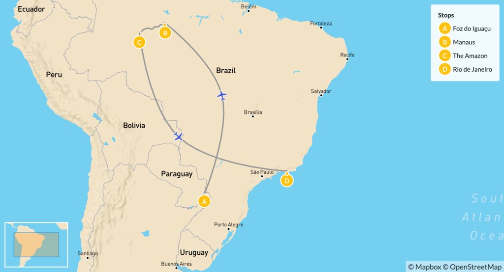 Map of Eco Travel in Brazil: Amazon, Iguaçu Falls & Rio de Janeiro – 11 Days