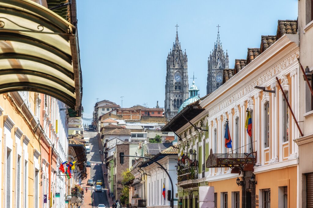 Other stops to follow include La Mariscal, an area with cafés, museums, and galleries that show the culture of Ecuador. For souvenirs, head to the local artisan market, where you will find a variety of colorful crafts with unique designs. Another stop on the tour is La Basilica, the largest Gothic Revival church in South America. Here you can reach one of the highest viewpoints in the city by climbing the steps of one of its towers. You’ll also want to dedicate time to Quito’s UNESCO-listed Old Town for colonial architecture, churches, convents, museums, and charming restaurants.