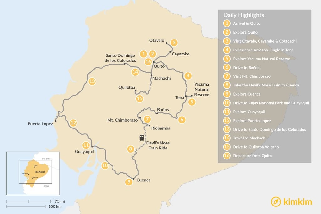 Map of Ecuador: Amazon, Andes, and the Coast – 16 Days