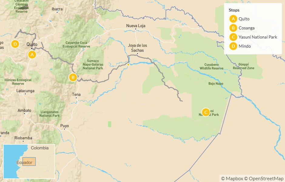 Map of Ecuador Wildlife & Bird-Watching Adventure: Cloud Forest, Rainforest & Andes – 15 Days