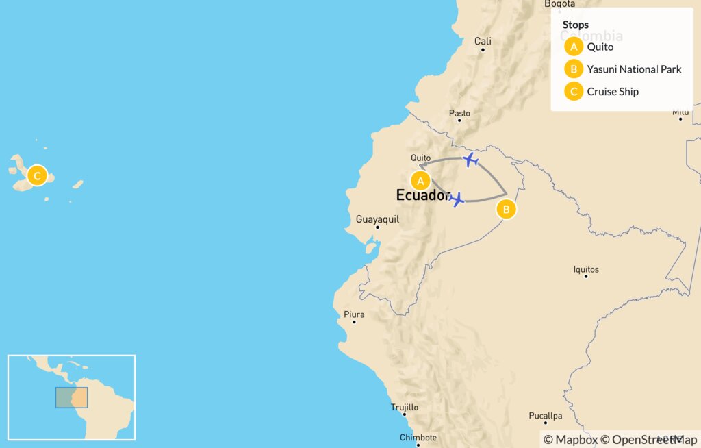 Map of Ecuadorian Amazon Adventure & Galápagos Cruise – 13 Days