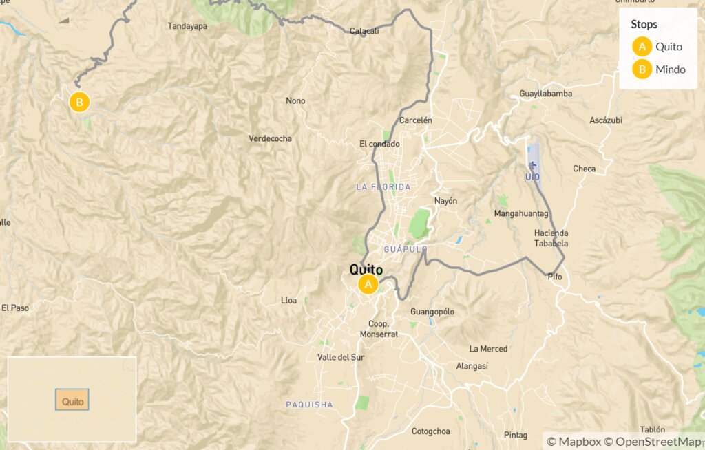 Map of Ecuadorian Culture & Biodiversity in Quito & Mindo’s Cloud Forest – 5 Days