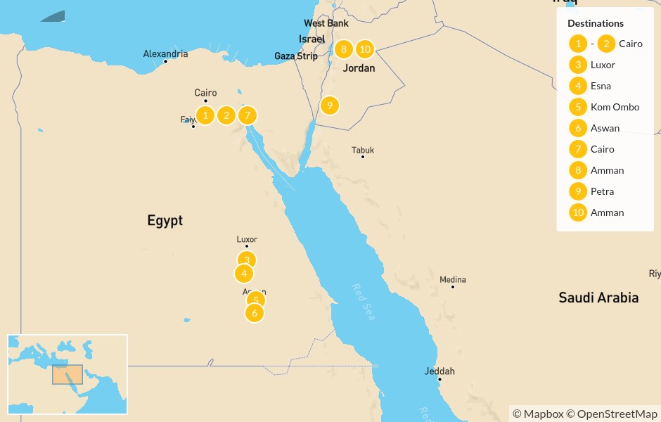 Map of Egypt & Jordan Cultural Tour: Cairo, Amman, Petra, & More – 11 days