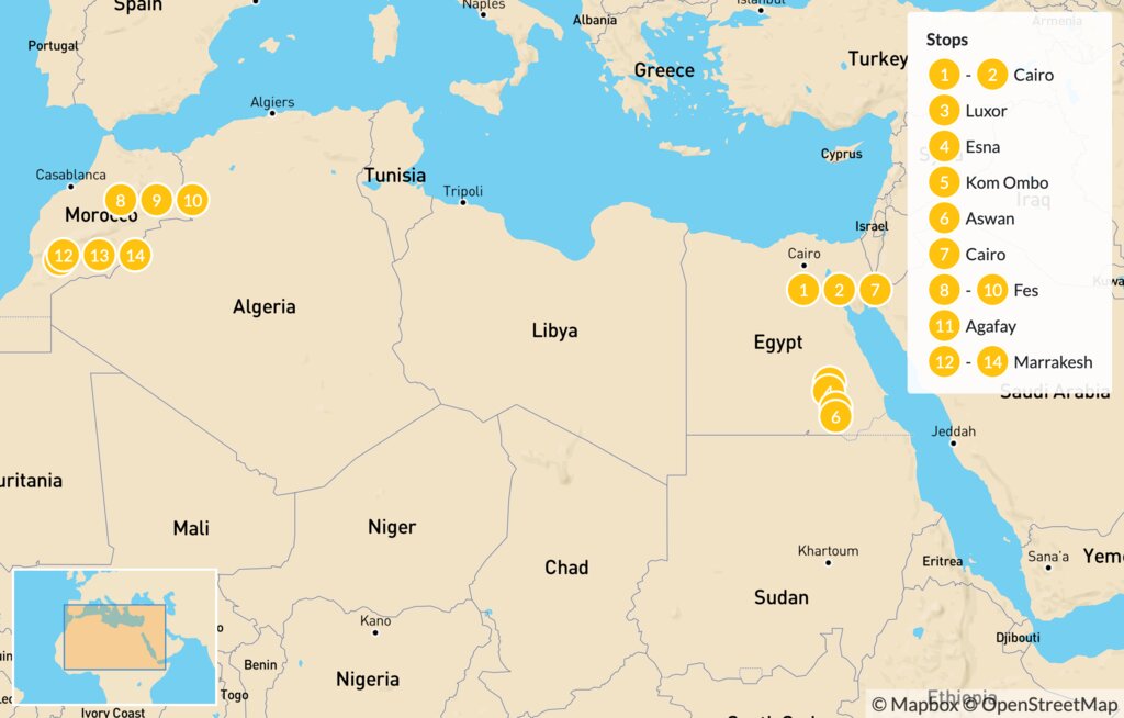 Map of Egypt & Morocco Highlights: Cairo, Nile River, Fes, Marrakesh & More – 15 Days