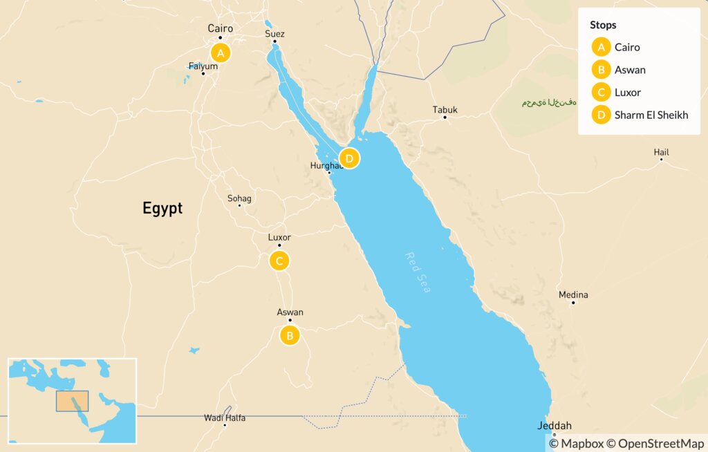 Map of Egyptian Culture & History Tour: Cairo, Aswan, Luxor & More – 14 Days