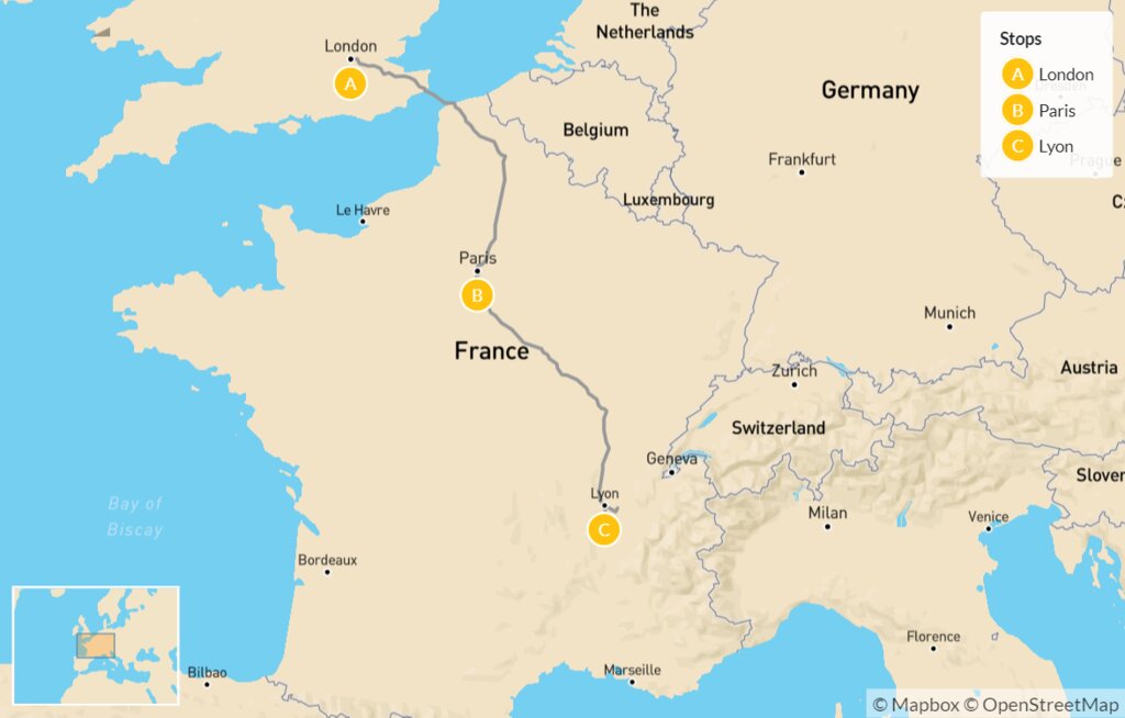 Map of England to France: London, English Countryside, Paris & Lyon – 14 Days