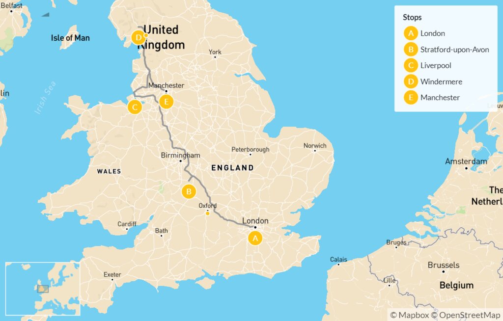 Map of English Culture & Nature Tour: London, Stratford-upon-Avon, Liverpool & Lake District – 10 Days