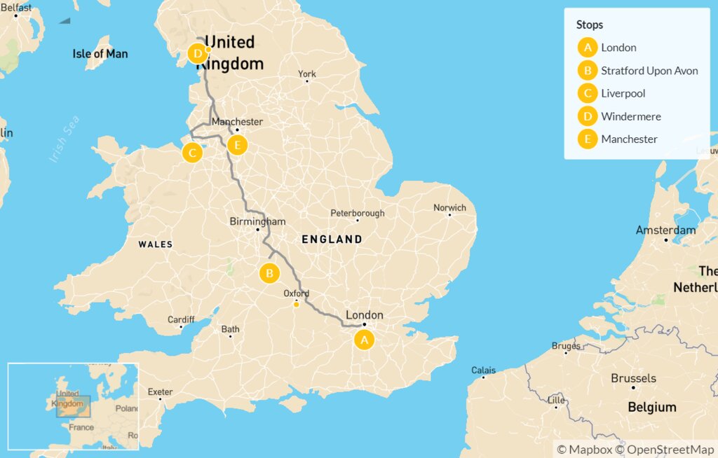 Map of English Culture & Nature Tour: London, Stratford-upon-Avon, Liverpool & Lake District – 9 Days