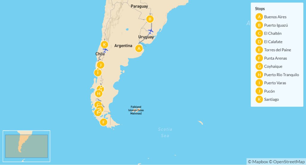 Map of Epic Argentina & Chile Discovery: Buenos Aires, Iguazú Falls, Patagonia & the Lake District – 21 Days