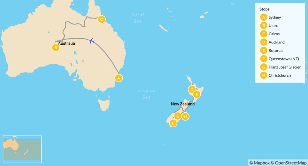 Embark on an epic 18-day adventure through some of Australia and New Zealand’s most iconic landmarks and astonishing landscapes. See Sydney’s famous sights before heading into the outback to witness Uluru set aglow at sunset. Spend a night on the Great Barrier Reef, then fly over the ditch to Auckland, where you’ll set off to discover Rotorua’s geothermal activity, immerse yourself in Maori culture, cruise across Milford Sound / Piopiotahi, and take a heli-hike up Franz Josef / Waiau Glacier.