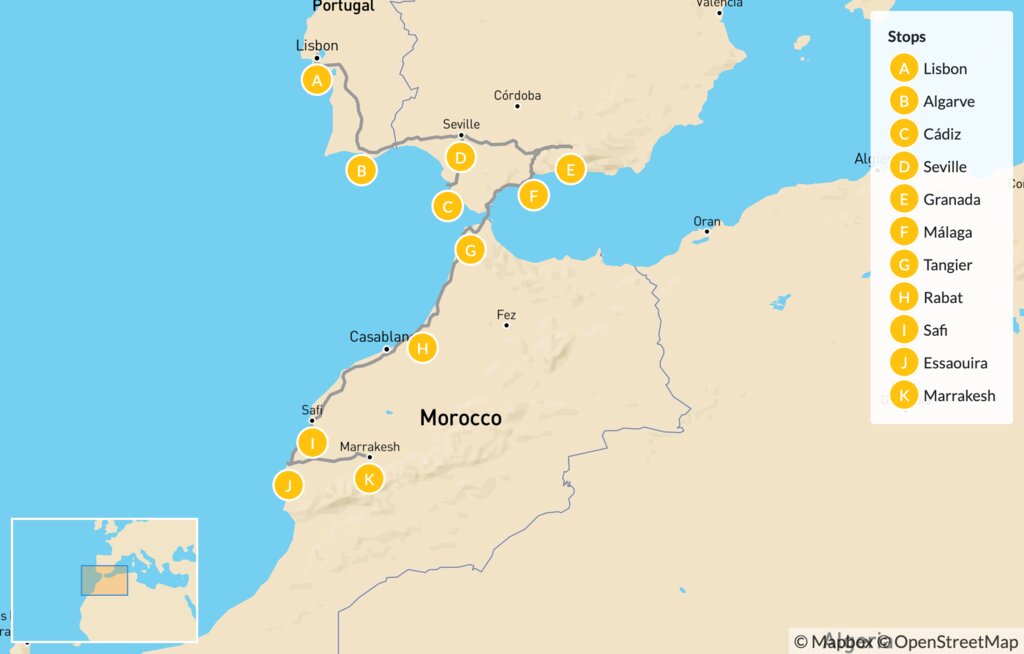 Map of Epic Coastal Tour of Portugal, Spain & Morocco – 21 Days