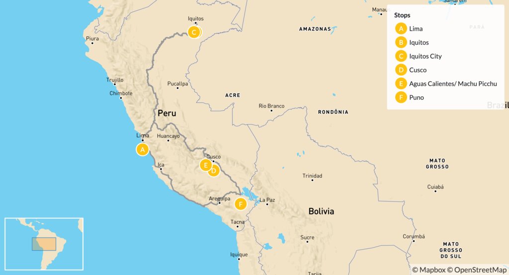 Map of Epic Family Adventure in Peru: Amazon Rainforest, Sacred Valley & Lago Titicaca – 14 Days