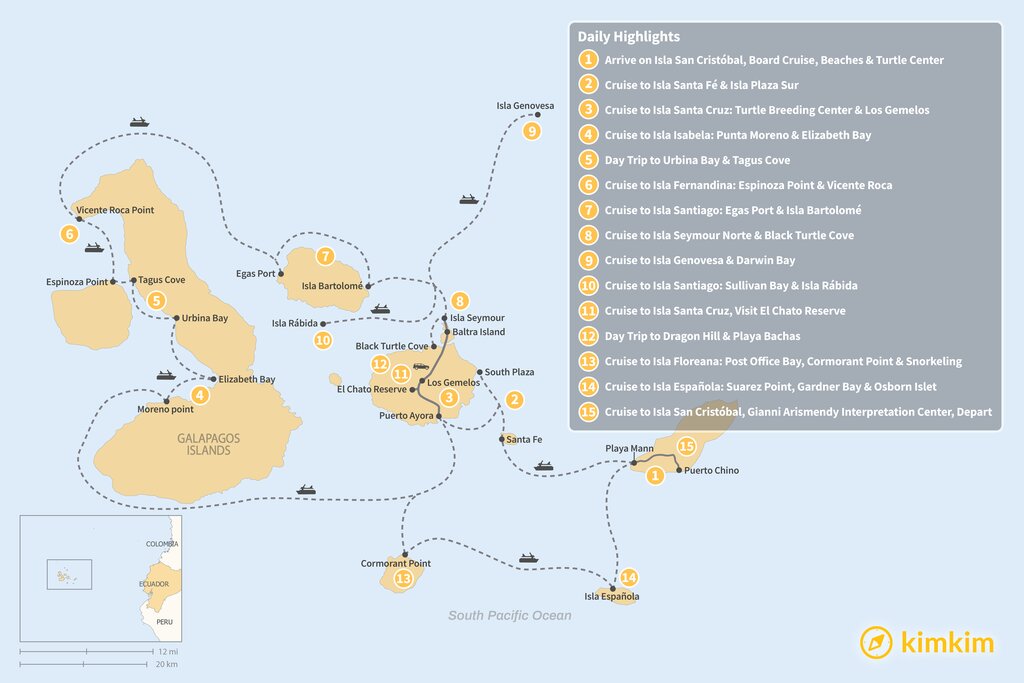 Map of Epic Galápagos Exploration by Luxury Yacht: Cruise to Remote Islands, Hidden Bays & Rare Wildlife – 15 Days