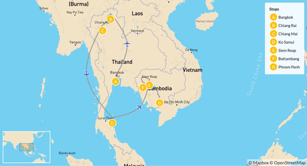 Map of Epic Highlights Tour of Thailand & Cambodia: Ancient Temples, Lively Markets & Pristine Beaches – 21 Days