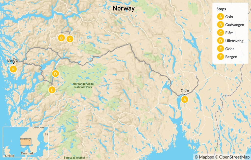 Map of Epic Norway Camping, Kayaking & Hiking Journey: Oslo to Bergen – 15 Days