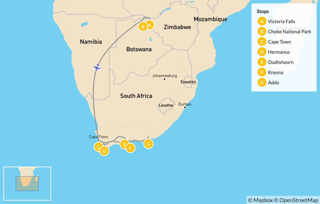 Map of Epic Southern Africa: Victoria Falls, Chobe, Cape Town, Garden Route & Addo National Park – 21 Days