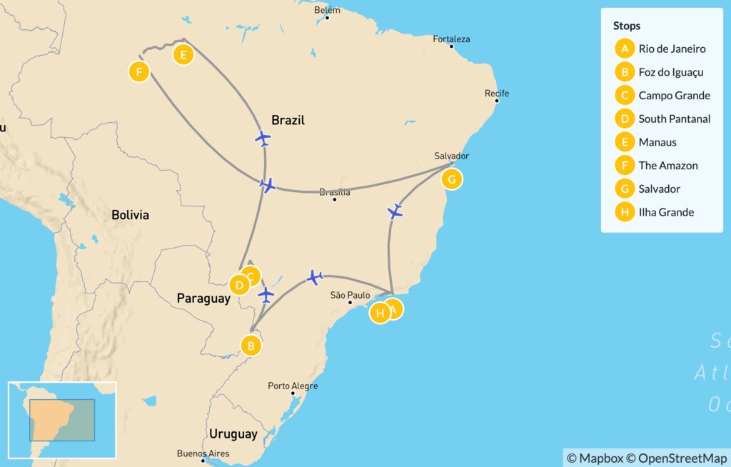 Map of Epic Tour Across Brazil: Urban Cities, Cultural Excursions, Beaches & Rainforest – 21 Days