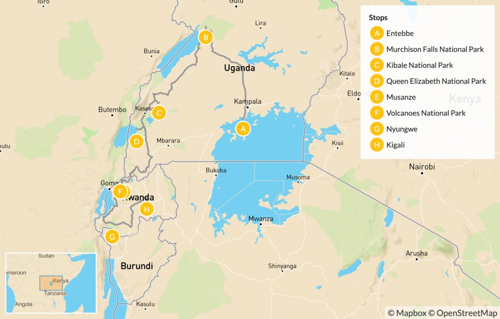 Map of Epic Uganda & Rwanda Adventure: Entebbe to Kigali – 14 Days