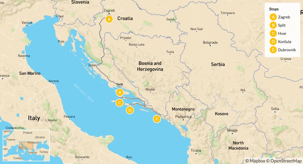 Map of Essential Croatia: Zagreb, Split, Hvar, Korčula & Dubrovnik – 10 Days
