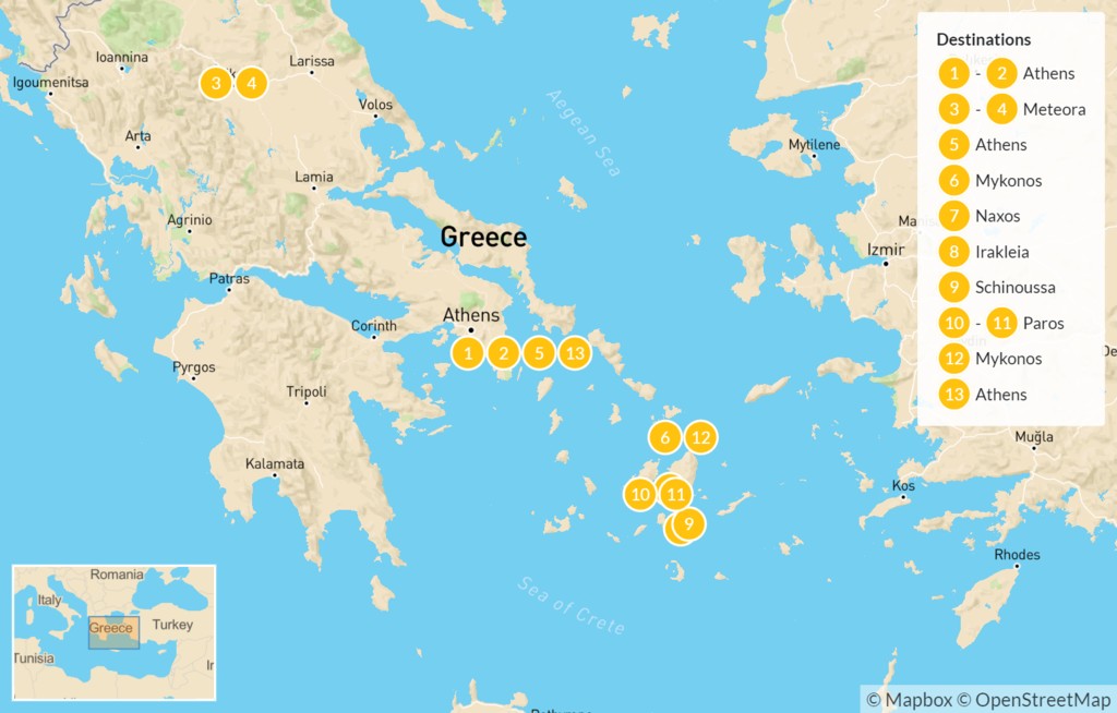 | Day 13 | Depart Mykonos – Ferry or Flight to Athens | Athens |