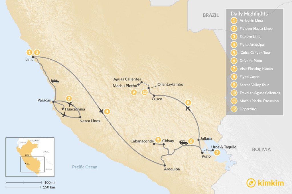 From the Colca Canyon to Machu Picchu, this 12-day itinerary takes you to Peru’s major highlights. Fly over the Nazca Lines, some of the world’s most impressive geoglyphs, before exploring Lima and the colonial city of Arequipa. Then visit Lake Titicaca, Cusco, and the Sacred Valley. Cap off your trip by walking in the footsteps of the Incas on a short hike to Machu Picchu.