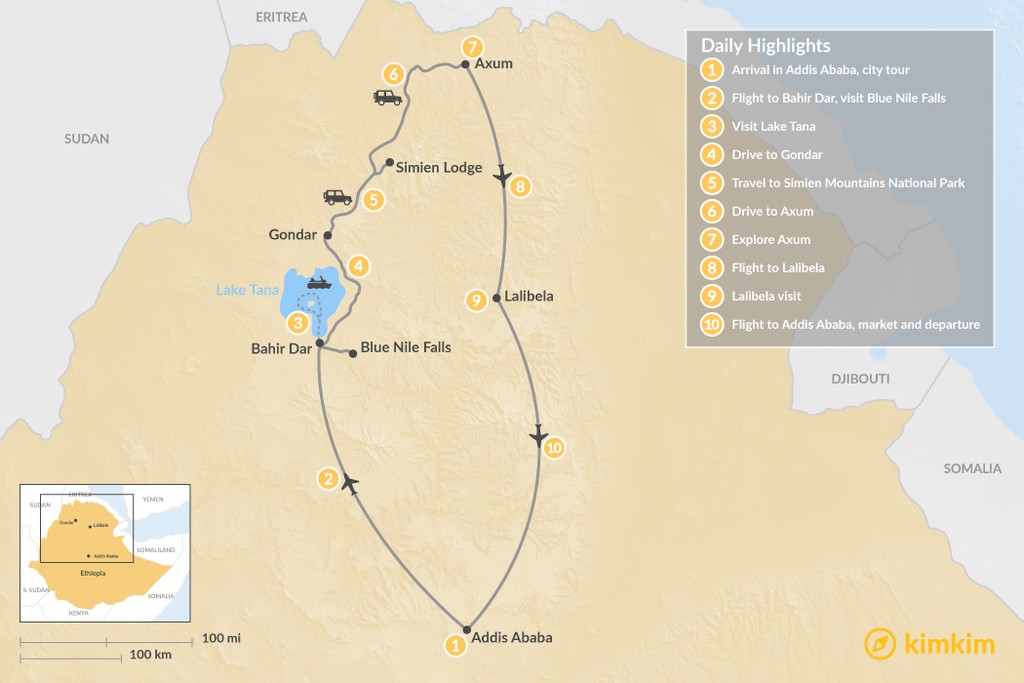 Map of Ethiopia’s Northern Historical Route – 10 Days